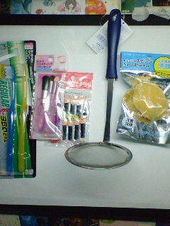 100均でいろいろと絵道具を買いました!画像の左から歯ブラシ、メイク小道具、料理用のアク取り(要するに網)、海綿です。びっくりしたのが、100均で海綿売ってたことです(@_@)前から海綿欲しかったんだけど、画材屋のホームページとか覗くとかなり高くて手を出せないでいました。今は100均で何でも売ってるんだなー(∵)ほー