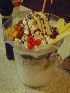 そこで、ジャンボパフェを頼みました!画像はその様子です。左後ろのほうに写ってるのは比較のためのマイク。でもこれじゃあんまり大きさがわからないが(笑)とにかく、想像以上にでかかった…!部屋にパフェが運ばれてきたとき、おもわず「でかっ!!」って(みみずくさんが)叫んでしまいました!金魚鉢ぐらいはあったはず。最初のうちは「うまいうまい」って食べていたけど、最終的には「もういーよ…」って感じに…あれだけで腹いっぱいになる。行きにプリンとか買っちゃって食べるのがしんどかった;一応全部食べられた…のかな?とにかくでかかった!!